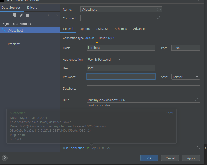 Test Connection 클릭해보고 드라이버 다운로드 받으라고 뜨면 다운 받아주세요