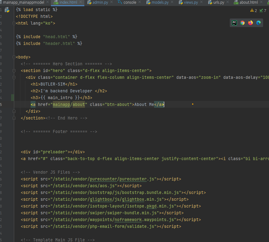 (4) (Django 개발부터 배포까지) 부트스트랩 포트폴리오 템플릿 적용하기 (3) | 2021.12.02 |