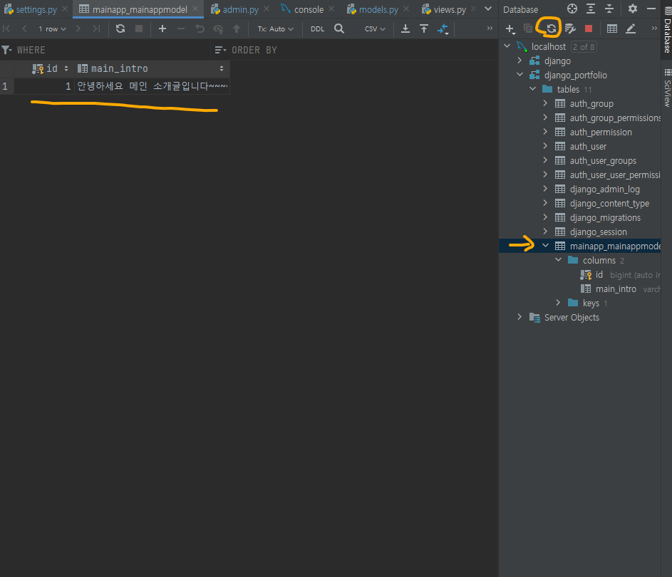 데이터 확인이 가능하니 db툴은 안다뤄도 될것같아서 파이참 기능으로 간단하게 진행할게요
