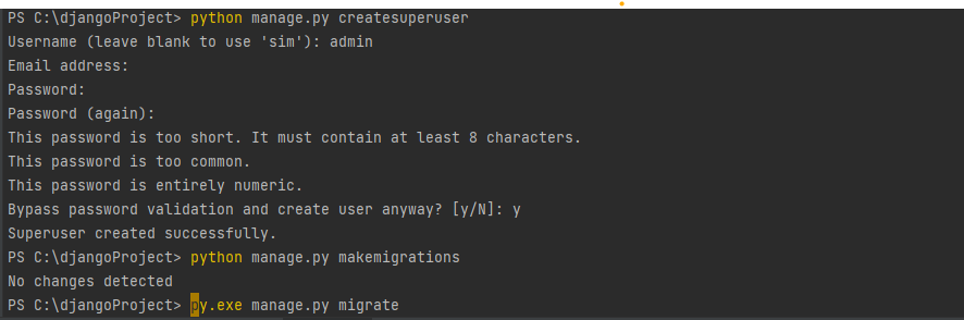 python manage.py createsuperuser 입력후 아이디 비밀번호 설정해주세요 [y/N]나오면 y입력