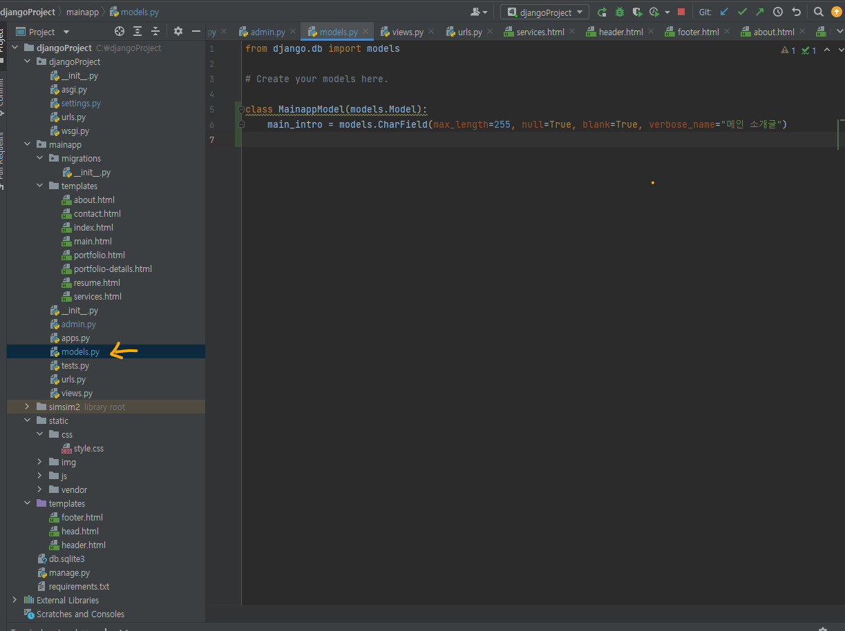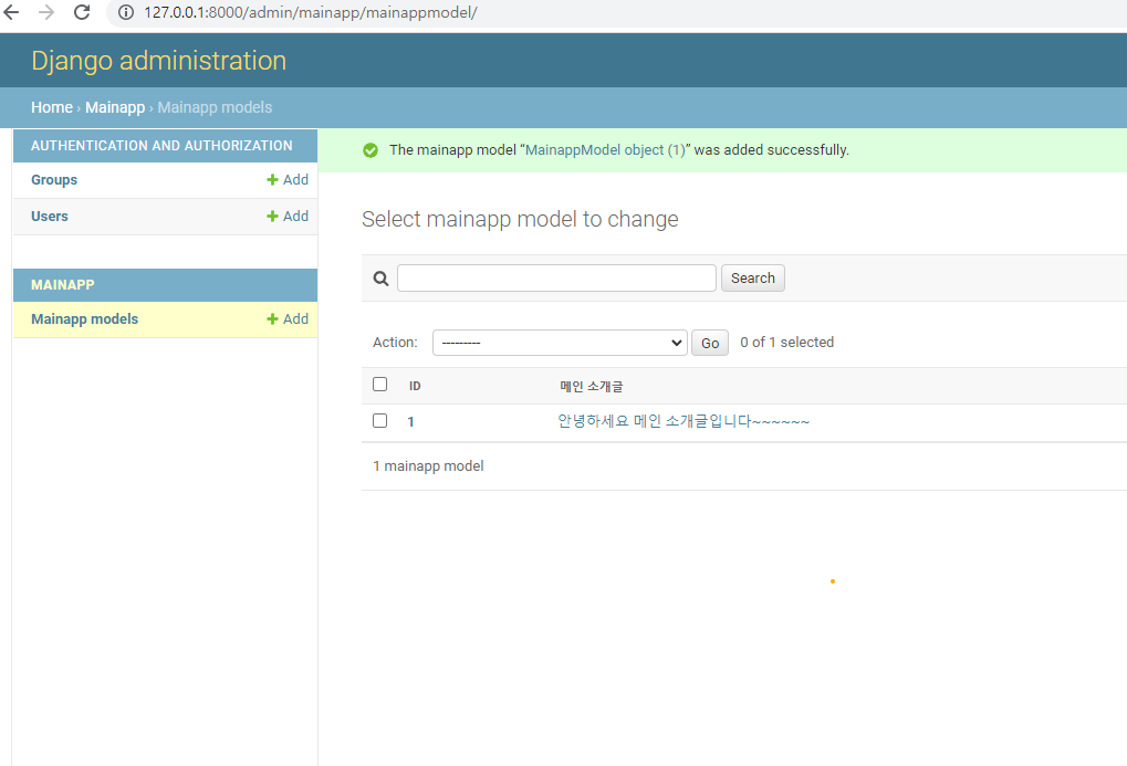 main_model = MainappModel.objects.get(id=1) # Mainapp테이블에서 id가 1인 로우 가져오기